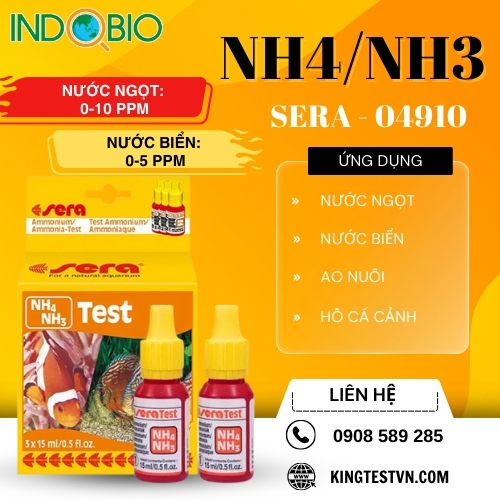 Bộ test NH4/NH3 Sera 04910 là bộ kit kiểm tra nhanh hàm lượng Amoni (NH4⁺) và Amoniac (NH3) trong nước ao nuôi tôm, cá, hồ cá cảnh và hệ thống thủy sinh. Kết quả cho biết mức NH4 tổng, từ đó dựa vào giá trị pH có thể xác định được NH3 - thành phần độc nhất, gây stress, giảm ăn và có thể gây chết thủy sản.
