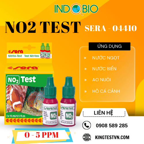 Bộ test NO2 Sera được sử dụng kiểm tra hàm lượng NO2 trong nước ao nuôi, hồ nuôi trong khoảng đo 0-5 ppm với 4 bước thực hiện. Bộ test cung cấp toàn bộ thuốc thử và dụng cụ cho 75 lần thử và được đóng gói nhỏ gọn trong 1 hợp giấy.