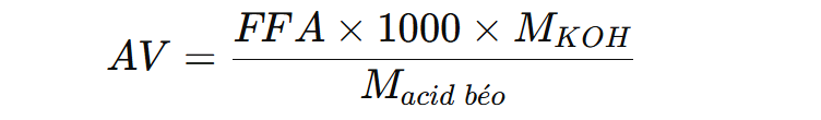 Có thể chuyển đổi giữa AV và FFA, tùy thuộc vào loại acid béo chủ yếu trong dầu. Đối với acid oleic, công thức chuyển đổi là: