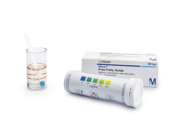 Que test AV 1170460001 là test nhanh axit béo tự do dạng que thử của Merck, trong khoảng đo 0.5-3 mg/g. Test axit béo tự do 1170460001 được xem là phương pháp bán định lượng cho kết quả nhanh chóng và quy trình đơn giản.