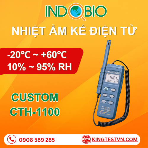 Máy đo nhiệt ẩm kế điện tử Custom CTH-1100 là thiết bị chuyên nghiệp đo nhiệt độ (-20 ~ 60°C) và độ ẩm (5 ~ 95%RH). Thiết bị còn cho phép kết nối cảm biến rời loại K (-200 ~ 1370°C, mua riêng), hỗ trợ tính năng REL để đo chênh lệch nhiệt độ giữa hai điểm. Với thiết kế cầm tay nhỏ gọn, CTH-1100 là công cụ đắc lực cho kỹ thuật viên, quản lý kho lạnh và kiểm soát quy trình sản xuất công nghiệp dễ dàng.
