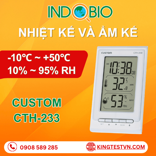 Nhiệt ẩm kế Custom CTH-233 là thiết bị đo nhiệt độ và độ ẩm không gian bằng cảm biến điện tử, giúp theo dõi nhanh chóng và chính xác điều kiện môi trường xung quanh. Thiết bị được thiết kế với màn hình lớn hiển thị đồng thời thời gian, nhiệt độ, độ ẩm, rất tiện cho sinh hoạt hằng ngày.