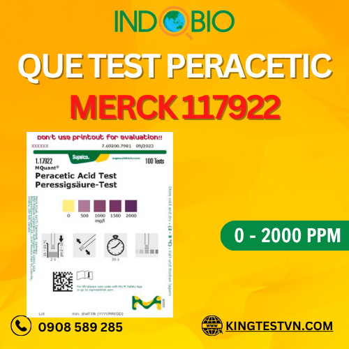 Que test paa Merck 117922 thử nghiệm nồng độ peracetic trong nước và dung dịch ở phạm vi 500 - 2000 ppm. Que test là phương pháp đơn giản, tiết kiệm, dễ dàng cho các ứng dụng sàng lọc nhanh trong ngành thực phẩm và khử trùng công nghiệp