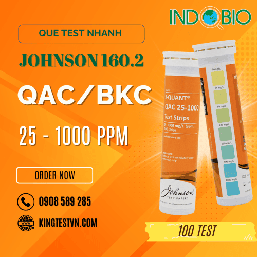 Test QAC 160.2 Johnson là que thử QAC theo phương pháp bán định lượng với thang đo 0-1000 ppm. Test thử QAC 160.2 sử dụng đơn giản, kết quả nhanh chóng và được đóng gói 100 test/hộp.