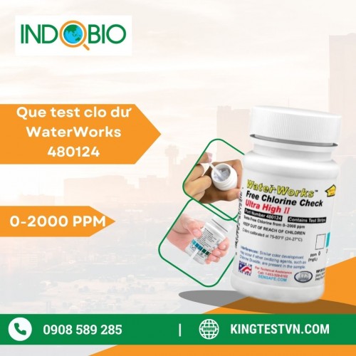 WaterWorks 480124 cung cấp 500 que test clo dư thang siêu rộng 0-2000ppm trong nước. Sản phẩm phù hợp để test kiểm tra nhanh clo trong nước sát trùng hoặc đánh giá chất lượng hóa chất chlorine.