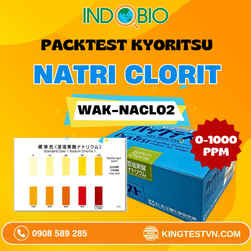 WAK-NaClO₂ là bộ dụng cụ kiểm tra nhanh nồng độ natri clorit (NaClO₂), sử dụng phương pháp so màu trực quan, trong đó natri clorit phản ứng với kali iodide (KI) để tạo ra màu đặc trưng, giúp người dùng dễ dàng xác định hàm lượng NaClO₂ trong mẫu nước bằng mắt thường thông qua bảng màu chuẩn đi kèm.