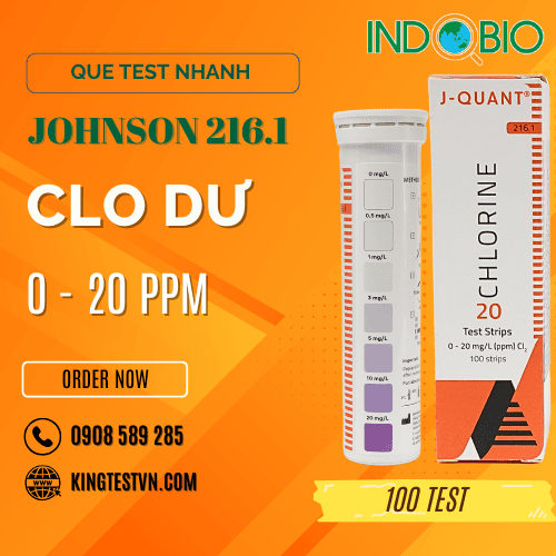 Test Clo 216.1 Johnson là test chlorine tự do trong nước và dung dịch theo phương pháp bán định lượng. Test thử clo 216.1 cho kết quả nhanh chóng với 4 bước thực hiện đơn giản trong khoảng đo 0 - 0.5 - 1 - 3 - 5 - 10 - 20 mg/L Cl₂. Chlorine test 216.1 đóng gói nhỏ gọn với 100 que/hộp được xem là một trong những cách kiểm tra clo dư đơn giản với chi phí thấp.